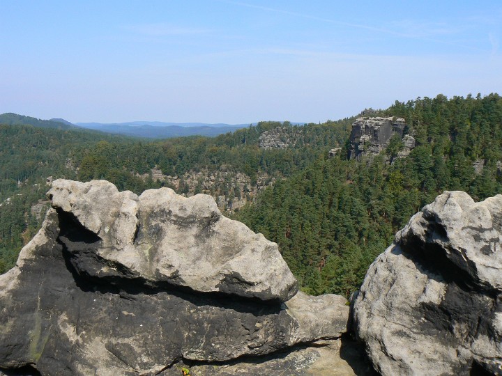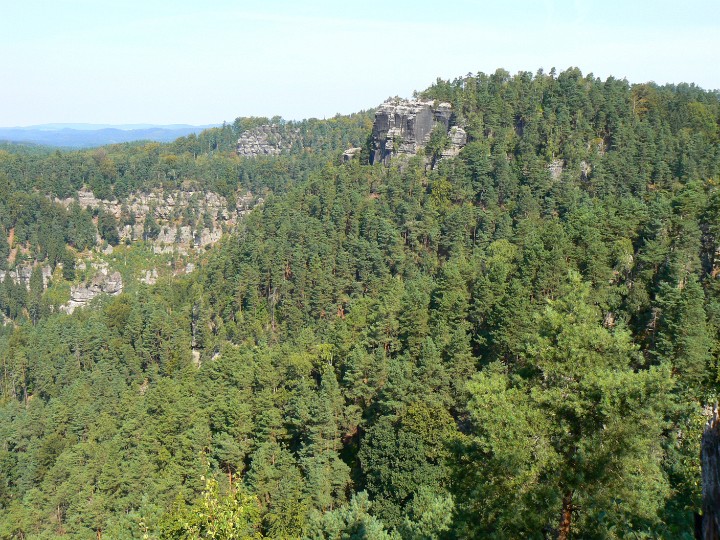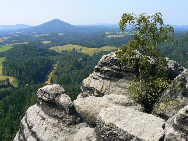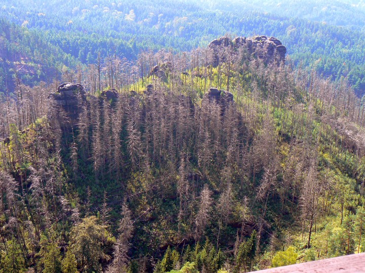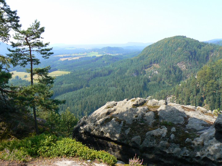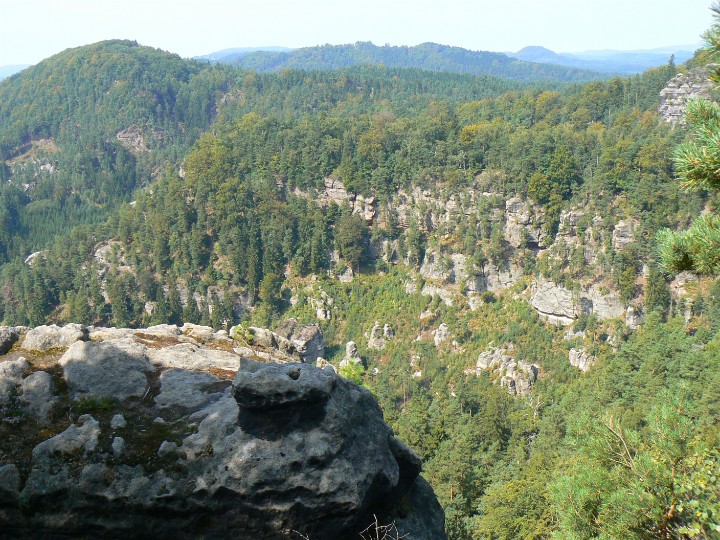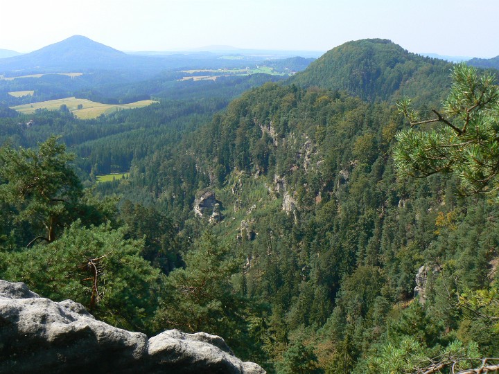 Výhled z Mariiny skály na ostatní vrcholky Vilemíninu stěnu a za ní Ostroh Zda se to blízko, ale to ten ZOOM.