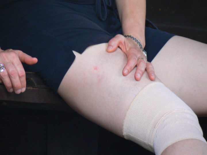 Lezeme. Koleno je pro jistotu zafixované Jak se později ukázalo, měla se zabalit celá noha